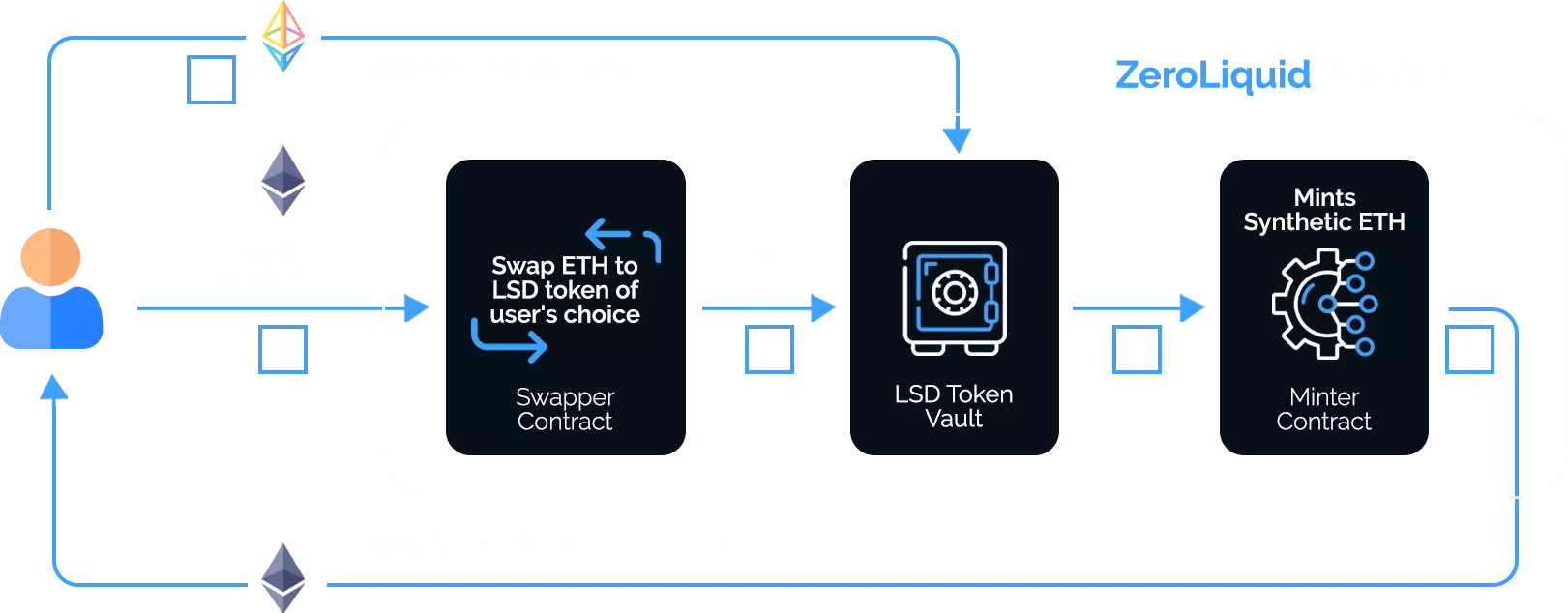 1. A user deposits an LSD token such as stETH into ZeroLiquid. Alternatively, they can supply ETH and the protocol will convert it to the user's preferred LSD token.
